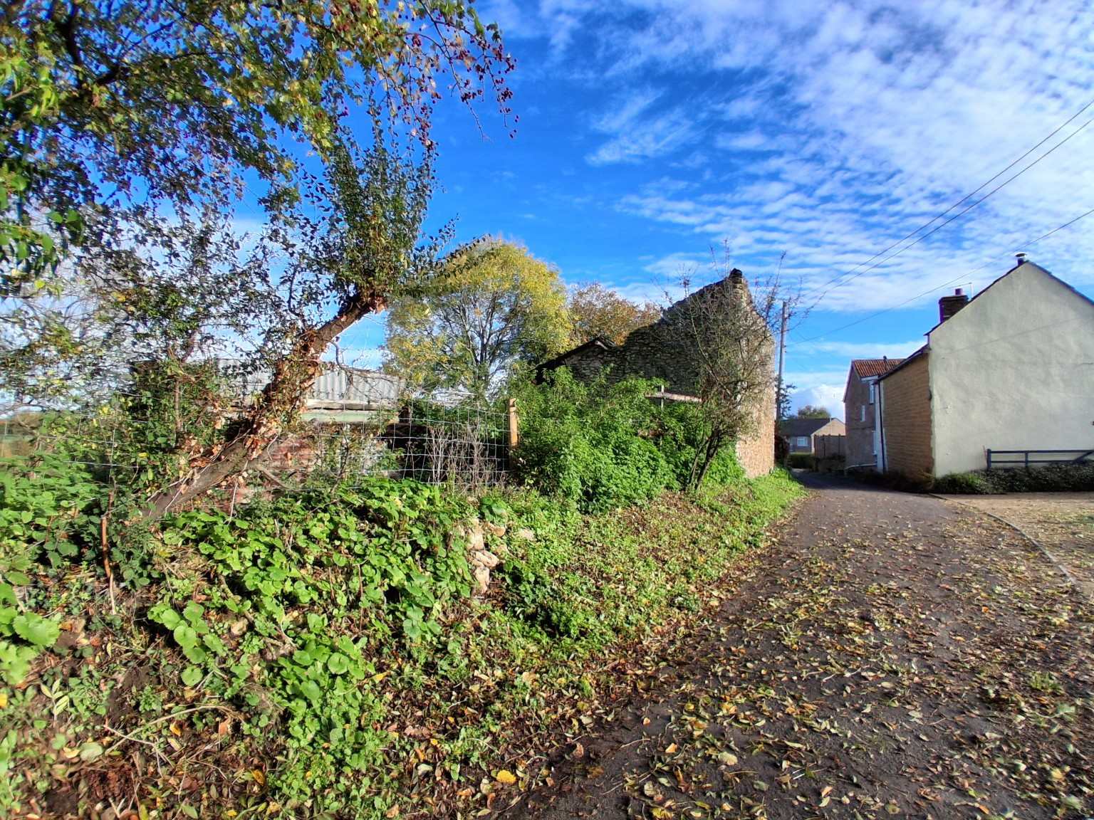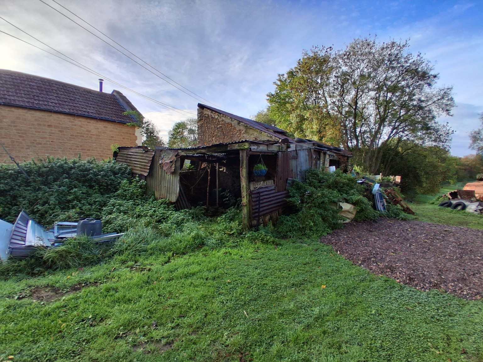 Rubble-stone barn with sections of collapsed walling and a corrugated tin roof in poor condition.