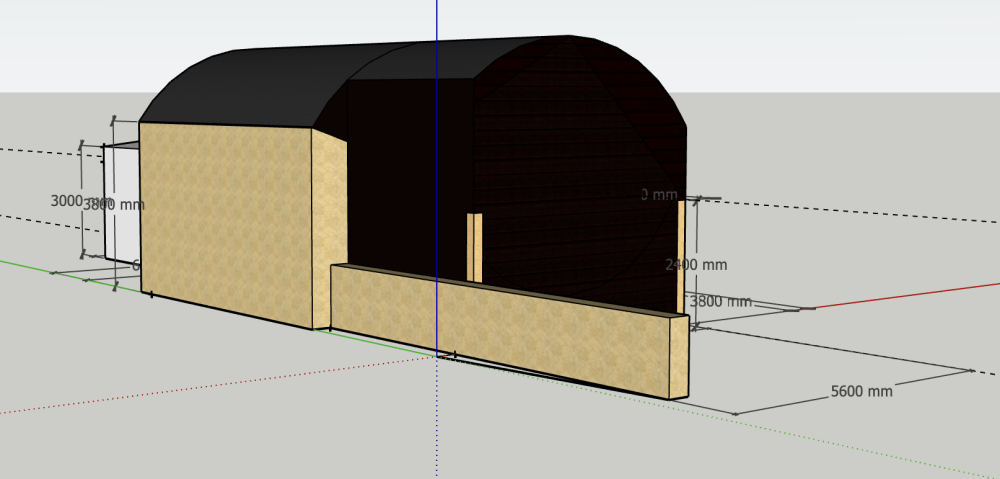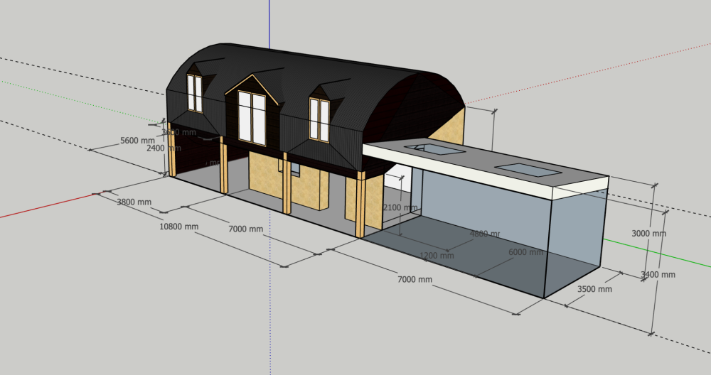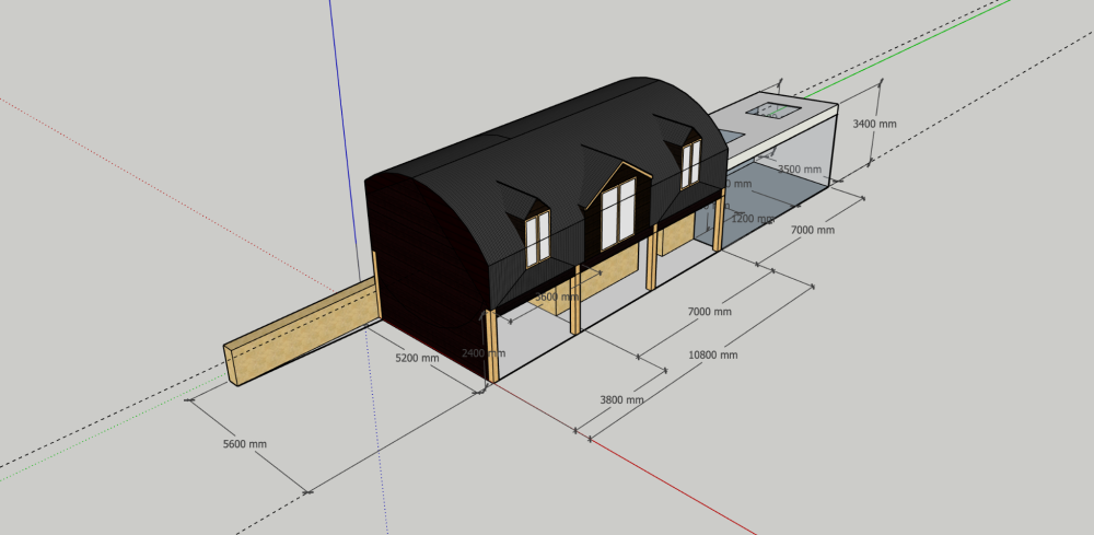 Roof: Curved glulam beams forming a Dutch-barn-style arch, finished with new corrugated galvanised sheeting to match the original character.