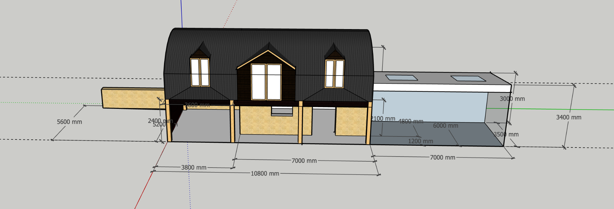 The existing footprint is roughly 10.8 m × 7 m, with a 7 m × 3.5 m rear extension planned.