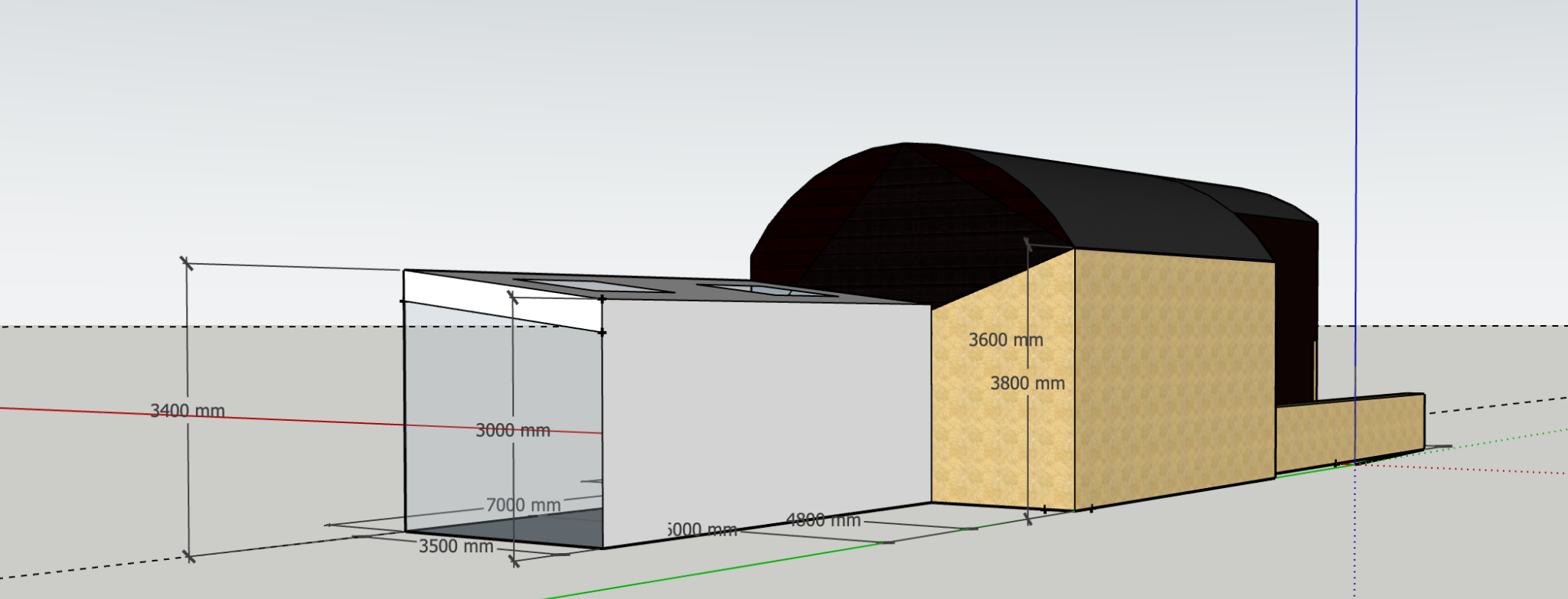 Photos below show the current barn condition and context in the old farmyard, and the SketchUp visuals illustrate the intended rebuild form.
