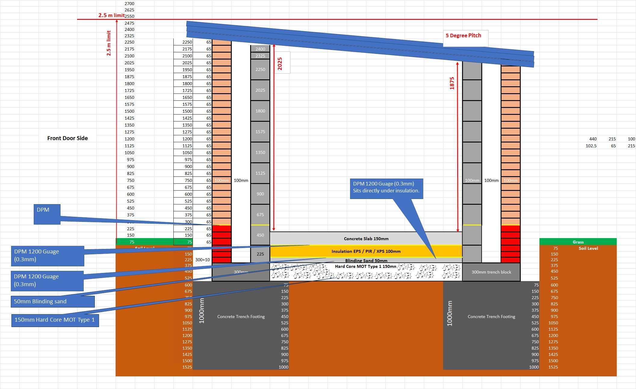 The plan is to stay within permitted development, which (from my understanding) limits the overall height to 2.5 m at the highest point. The building will be single storey, constructed on trench foundations, with brick and block walls and a single-pitch (hybrid) roof.