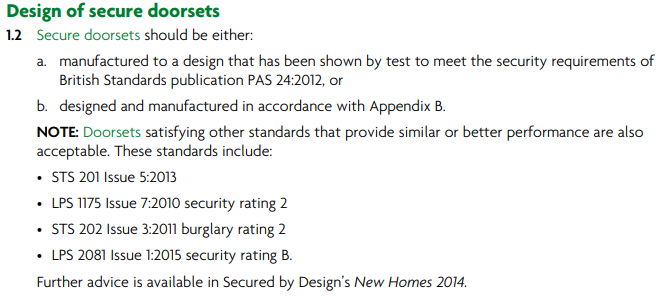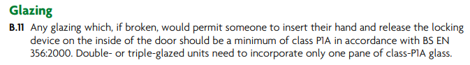 A while ago, I started a thread about Part Q Front Doors. As the first part of a house that you interact with, I like the idea of having a door I 'made'. Since then, I have identified a PAS24 certified, door (FlameBreak) which has good thermal properties and I could dress with timber to make the sort of door I want. Problem solved if I just wanted a door in a door sized hole in the wall. Unfortunately it isn't so easy as I want to have a glass side light panel either side, AKA a vestibule frame: I'm now left with the complication of the door frame and surrounding glass as I can't find a frame that is PAS24 certified. Not that PAS24 is required, but it demonstrates Part Q compliance. I am happy to build the frame and fit glazing units myself, but need to be confident I'm meeting the requirements of Part Q. I have copied the relevant sections below, but as I understand it, I would be compliant if I built the door frame and side lights consistent with Appendix B and that means: Timber section minimum dimensions 44mm but can be rebated down to 32mm. Appendix B only really sets out dimensions for elements of the door itself, not the frame, but using that dimension would seem a good approach. Glazing unit would need to incorporate P1A glass. (would need to be toughened and have a suitably low U-value too, but that's not part Q) The side lights would each be about 540mm wide, so wider than 230mm. Am I being optimistic interpreting the panel requirements as not applying to glazed elements? Has anyone else navigated these waters? ------------ ---------------- .......