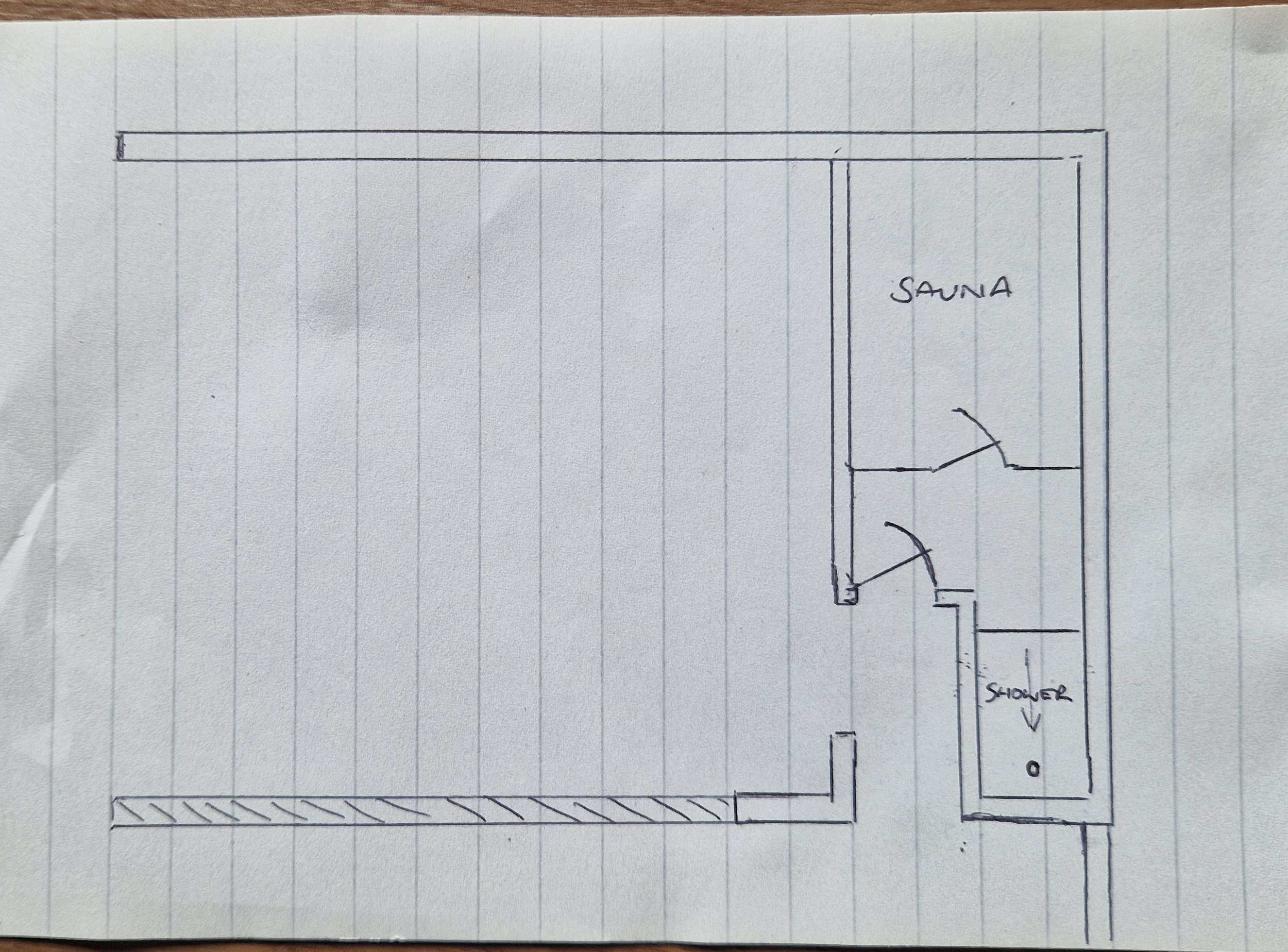 We have a Car Port in our design that's linked to the house via a covered walkway. The Car Port itself it open. We are really fond of having a Sauna within our scheme, but not enough room in the house and so I decided to increase the length of the Car Port in the hope of incorporating a Sauna within a partitioned structure at the rear of the Car Port. On further thought, I would really like to include a small shower and changing area but space is pretty tight as I don't really want to compromise on the 2m x 2m internal size for the Sauna. Does anyone here have a Sauna? Do you have anything to add in terms of sizing? This is my "fag packet" sketch (not at all to scale, yet!) The external walls of the Car Port are double skin with an uninsulated Cavity. The partition walls are likely to be 100mm facing bricks with a proper sealed door into the Changing Area. The Sauna itself is a separate discussion, but that will be built and insulated according to Sauna best practice. I'm interested in the Changing and Shower Area at the moment, which I want to make comfortable to use (not necessarily luxuriously warm, but usable in Winter) and so I am thinking of applying some insulation to the walls. What thickness of insulation (PIR?) should I consider for this? 50mm? The structure is somewhat shielded from the prevailing wind by the house itself and I can insulate the floor and ceiling.