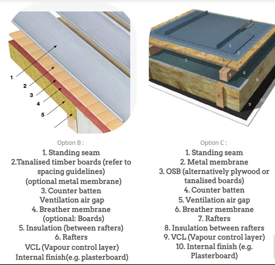 @SimonD didn't suggest woodfibre. My understanding is, woodfibre sarking boards are used when extra insulation is required, & they're likely held down onto rafters with softwood battens, so their sub-optimal pull out qualities aren't a concern. If you already have a ton of Kooltherm on your roof, as your drawings show, you don't need to worry about another few mm of insulation. I think @Russell griffiths is suggesting 150mm x 25mm treated softwood planks. These don't fully cover the roof - I've seen them installed with 10mm or more gaps between each plank, so they support the standing seam & the gaps assist in drying, should the wood become damp. I'm no expert, so listen to others' views, but I'd want some ventilation under the standing seam. I'll try to find a picture... Of course, the problem with the treated softwood 150 x 25mm is, the materials cost is going to be more than OSB (or even 22mm ply) & they're going to take a lot longer to install, as well. I haven't done the maths yet - I need to, because this is exactly what I'm planning to do for my roof.