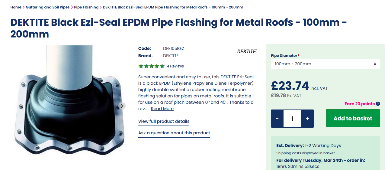 If you have corrugated steel profile roof sheeting something like this may be more suitable for the weathering detail. Your air tight layer is further into the depth of the roof. The issue is sequencing of the build process. Weather proof steel sheeting is probably going to go on first before you start to introduce plasterboard and air tight layers. You probably need a second flashing to pipe gizmo that you can bond to your air tight layer. Your air tight layer is usually a plastic membrane so we need something that you can use to bond the plastic to the soil pipe. Remember that soil pipes expand and contract a bit when you empty the bath warm water for example, thus we need something flexible. Can we just rely on air tape or do you want something more " professional" looking. Like this: