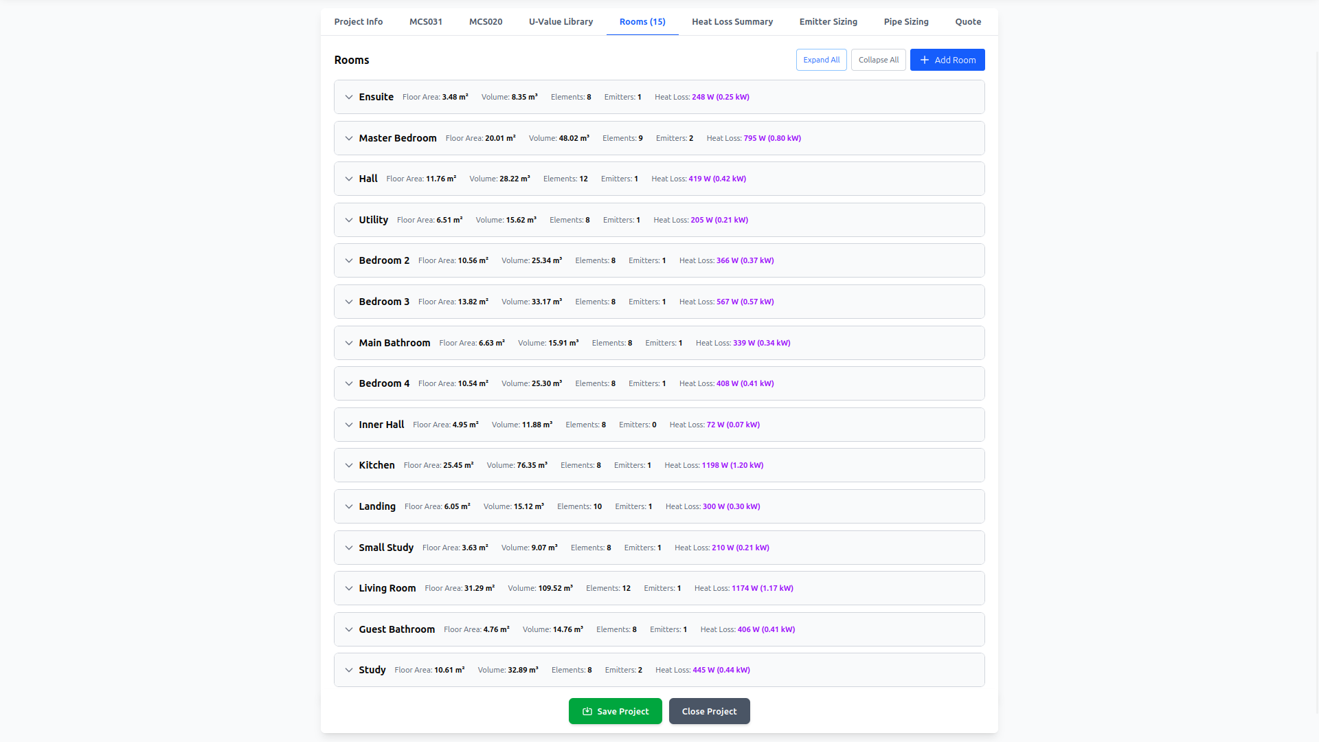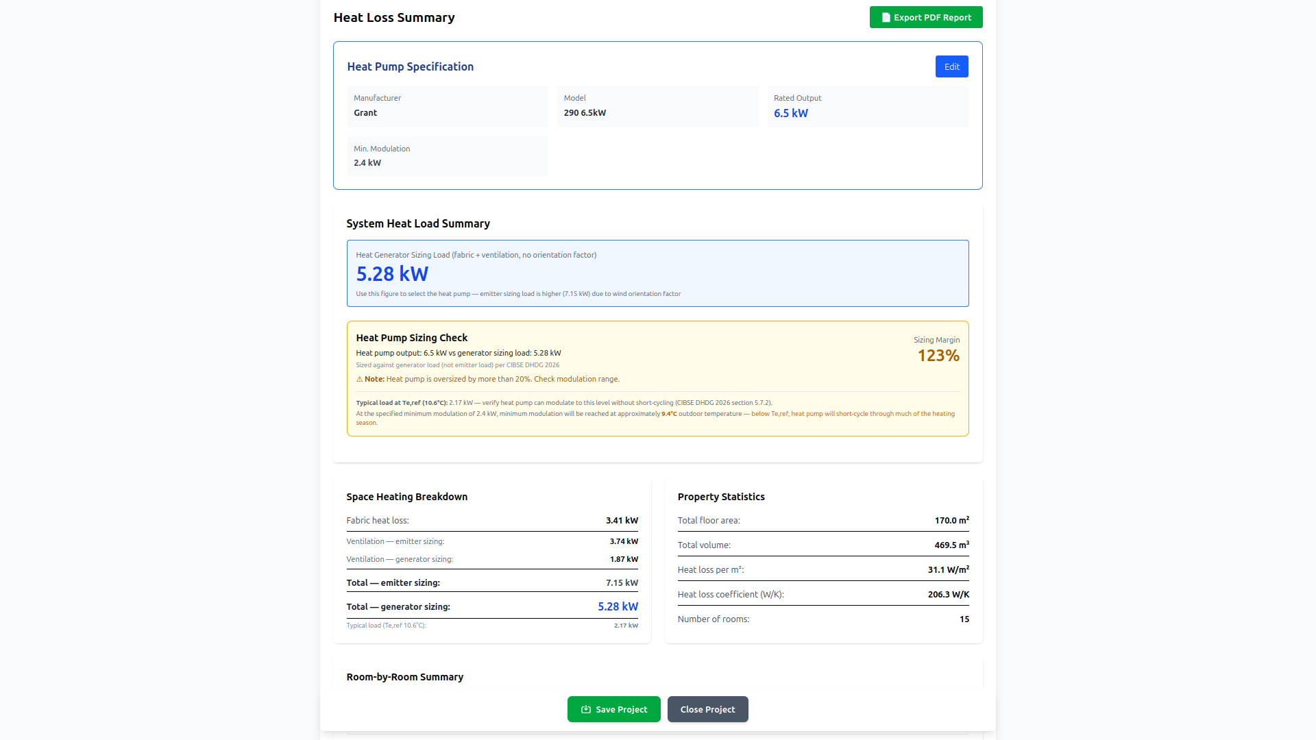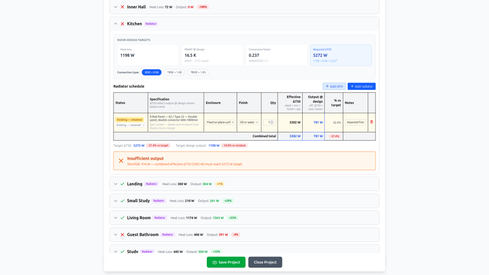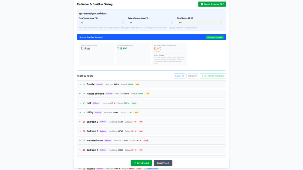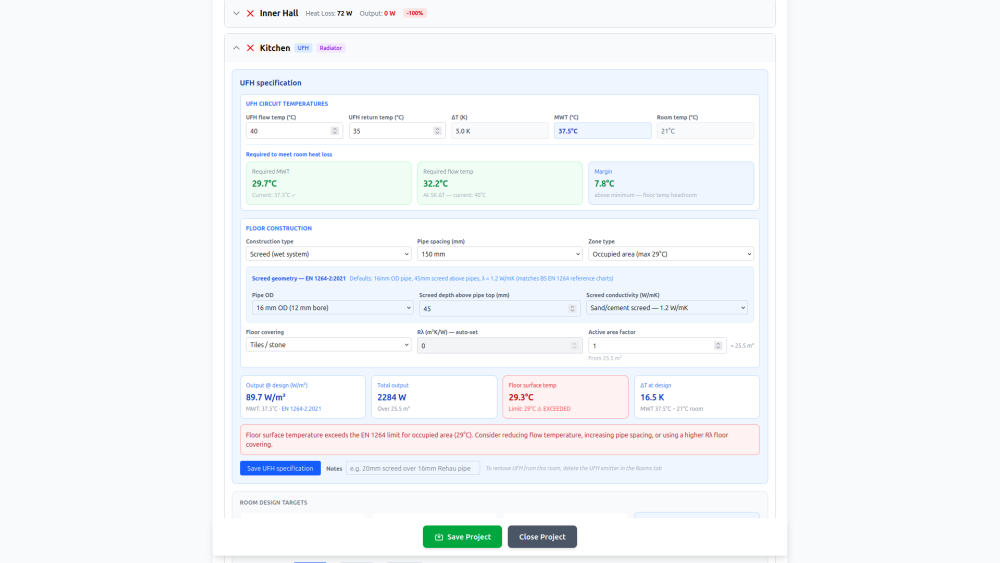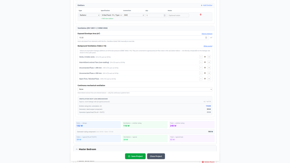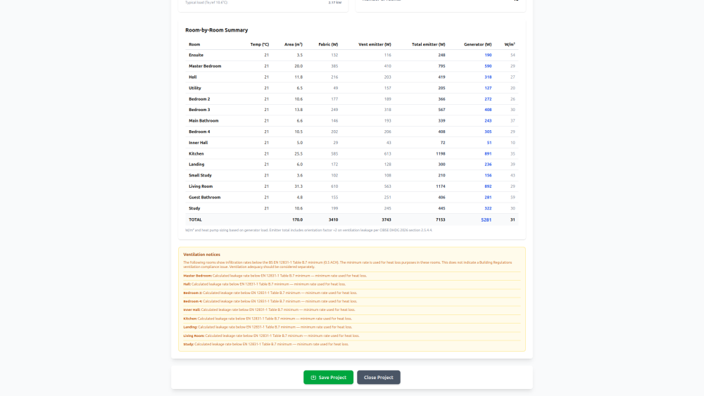 Better if you can send a dimensioned copy of the floor plans and elevations together with all the U-values for the elements - windows, doors, internal/external walls, floor, ceiling, roof, etc. - and the design air permeability or test results in q50 and any MVHR specs. Then privately share your postcode. If I have all these details I can run a fully BS EN12831 heat loss calc to current MCS standards which not only provides a heat generator loading, but also the room loading based on calculated air permeability. I can then also provide initial figures for any underfloor heating design and requirements together with flow temps & floor surface temps assuming that's what you're having. I have a tool that will soon be available free for self-builders, but I'm currently working through final bug fixing and hosting, so it's going to take a few weeks until it's online. Please feel welcome to send me a PM. -
