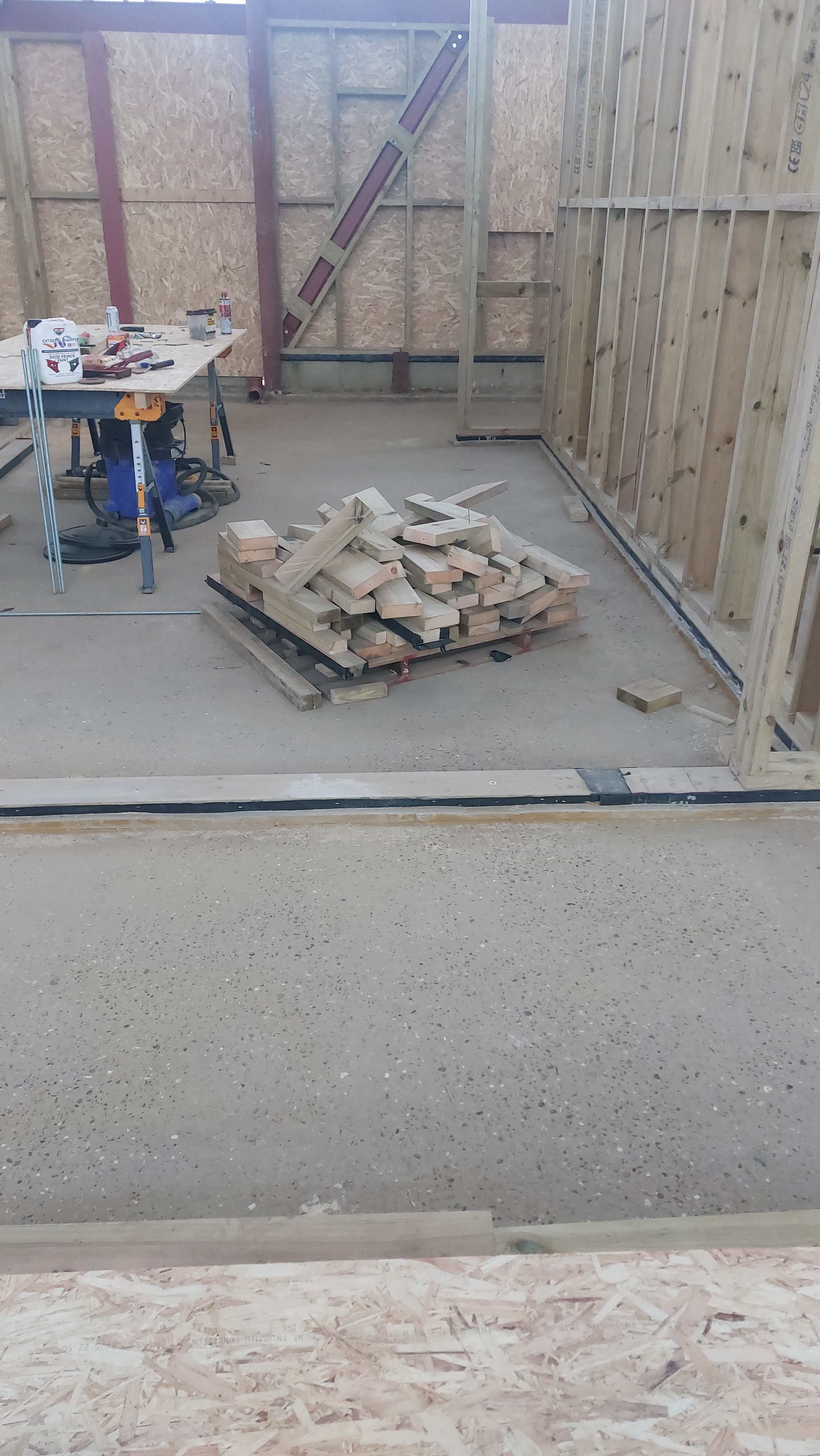 For context this shows the construction. So to the external face there will be a pir edging onto the block face. The finished floor is at the top of the block. Elsewhere the construction is all stud., and no facings yet. Obv we don't want to flood screed through the walls. Btw that is the offcut pile from several 100 metres of stud. -