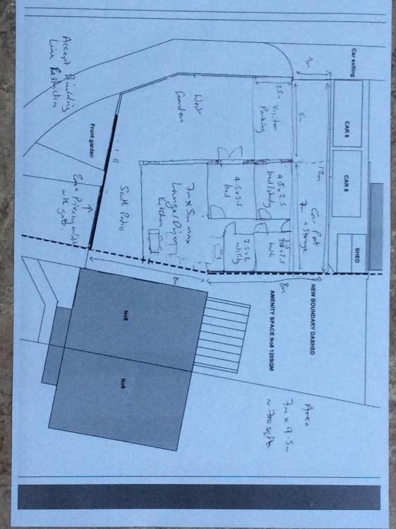 Interesting. The other 2 options I thought about were an L shape, as you suggest, or a south facing U plan with a sun trap courtyard in the middle. BUt the main thing on this thread is to make sure that the OP is not restricted in his/her head to a limited template laid down by the outline, and has the confidence to debate the architect as a demanding client. ONe quite different alternative should stop that happening. AS it is the rooms at the back are a utility and a bathroom, which are fine with skylights and the single public room gets sun from mid morning till sunset, and the bedrooms later on. I would want several skylights, at least to give slanted sun in the morning in the lounge. If I was interior designing it, I would perhaps have skylights above the corridor and some form of clerestory between the corridor and bedrooms to get the morning sunbeams in to play joyfully on the glowing skin of ... etc. The toughest constraint for me here was the parking, which can only be where it is due to the corner, and the need to avoid a tandem driveway and go side by side, which is much better. Those spaces are very tight indeed at 5m length. THe one I have done could lose 0.5m off one dimension of every room, so the entrance can be created anywhere. Personally I would probably go for a back door from the car parking, and a 'front' door entered from the south up a path behind the property emerging next to the utility. Perhaps covered over for a FLW style mystery drawing in rabbit hole feel as you walk in. I would aim to shunt it up the plot some way., and potentially have a third room as a study as a third 'bedroom' is a big perceived benefit. But I would not sacrifice all of the extra space - my experience dealing with tenants is that there is a HUGE perceived difference between a 3.5x3.0m room, and say a 3.0 x 4.5m or 3.5m x 4m; in a lounge it gives the opportunity for a second area in addition to lounging without it feeling cramped. The same goes for bedrooms, where you have space for an easy chair or exercise bike or handbag display unit. So I like working with dimensions of 3.5m and 4.5m. Privacy is less of an issue than might be expected here, as there is a 2m fence approved on the fence line, which does not show. Presumably that would be allowed on the building line on the S side too. The final issue here is build cost, which argues against a more complex shape. IF the whole thing can be done with a single A frame roof - I would cathedral the lounge kitchen area and the beds and corridor - and no cross gables, then that will free up cash for other things or and extra space. THere would be an argument for stepping the wall in to make the parking spaces 5.5 or 6m, whilst retaining an overhang. Had I the option I would have chopped off the corner of the lounge to follow the shape of the boundary, but that would complexify (!) the roof and cost several thousand extra, which could be used to pay for 2 or 3 roof lights or a nice holey brick wall at the front. That was my thinking, anyway. F PS posted the blank map so others can play. GO on go on go on... -