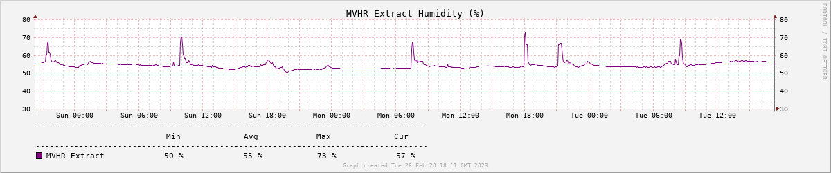 MJNewton Posted March 2, 2023 Posted March 2, 2023 I did wonder if this should be in the MVHR section but actually it's more about the technology side of things so figured Boffin's Corner might be best place... The reason for posting is that I'm always really interested in reading about what other people have done with all things home automation, electronics, DIY etc and figured that the very people behind all that might well be interested in what I've been up to too. I've also got a bunch of graphs which for some reason have always appealed to me and I'm sure I can't be alone in that! So here goes! The follow graphic illustrates what it's all about, and that is essentially the 'command and control' of our Titon MVHR unit. Titon do sell an LCD touchscreen controller for it (although I'm not entirely sure if it is compatible with our particular unit) but it is pretty expensive and I figured I could do more for less, and have more fun in the process! It is based around the following components: Raspberry Pi Zero W - This is the 'heart' of the control system and monitors temperatures (using DS18B20 1-wire temperature sensors) in all the ducts (supply, extract, intake and exhaust) as well as humidity in the extract (using an AM2302 humidity sensor) and (soon) air quality in the supply (using a Plantower PMS5003 particulate sensor). As I will elaborate further below, with all this information it can automatically boost on humidity rises, cut back or turn off the ventilation entirely if outside air quality suffers, report heat exchanger efficiency etc and likely more things in the future too (I've been thinking about putting summer bypass under its control and perhaps complete fan control too). It also creates the graphs and serves them up for viewing in a web browser. Shelly Uni Smart Relay - Used as the interface between physical boost switches in the house and the MVHR unit so as to increases their utility in terms of allowing different actions for short vs long presses, but more importantly it also provides an easy way for boost and setback to be triggered from other triggers whether that be from the Pi, widget buttons on our smartphones and voice control via Alexa. Shelly 1PM Smart Relay - Used to monitor the power consumption of the MVHR as it was something I was interested in understanding even before fitting the system, and it used to also serve as a means by which to disable the ventilation in response to a fire but I have since decided I don't actually like that and would rather the ventilation kept working. It is still connected to the smoke alarm circuit though and will alert me via app/SMS if the alarms do trigger. Raspbery Pi Pico W - Acting as a 'mobile' means to interface with a PMS5003 air quality sensor whilst I am still playing around with it, but when the sensor goes in the ducting I'll read it directly from the Pi Zero from then on. So breaking down some of the functions further... Heat Exchanger Efficiency With knowledge of the supply, extract, intake and exhaust temperatures you can calculate heat exchanger efficiency in real time. The Paul Heat Recovery page on the subject describes two methods in more detail and the following graph illustrates what are fairly typical efficiencies figures (high-80/low-90%) I see from the unit: Automatic Humidity-Related Boost The Titon does have its own humidity sensor with an adjustable (but unmarked) threshold and whilst I've never actually tried it I've always assumed it would be susceptible to false positives (triggering when it shouldn't) or negatives (not triggering when it should) and perhaps more to the point was always going to be a bit of a pain to fine tune (and adjust seasonally) given that the unit is in the loft. So, given I am monitoring humidity (in the extract manifold) anyway if we look at a typical graph it is easy to see when boost needs to be triggered: Those peaks correspond to showering and cooking (e.g. mostly the hob) and as I said are really easy to spot with a rate-of-rise calculation. The Pi takes measurements every 5 minutes and as a starter-for-ten I set it to trigger the boost (via an API call to the Shelly Uni) if the humidity rose by more than 5% within the 5-minute window. This turns out to have been a perfect threshold as it has never knowingly missed a shower (or pan of boiling water) or triggered when it shouldn't have in the several years it's been running now so I've not cause to make any changes. Automatic Ventilation Setback This is the most recent addition to the control system, and is still work in progress but as it's been so interesting to me I thought I'd share the not-quite-finished product... Our neighbour (who thankfully we get in really well with, but even friends can be annoying!) bought a wood burner for their recently-built extension. We've been mindful of what we might be breathing in from it as it seems barely a day goes by when there isn't some article or other written on the subject. Indeed, on occasion over the winter we've seen smoke coming from it but more to the point we've been able to smell it through the MVHR too. Granted, this is mostly when I've seen the smoke and have jumped up on a chair to sniff the incoming air from one of the vents and it seems the planets have to be in alignment for this to occur e.g. a cold still day with no wind, the neighbours using damper-than-ideal logs etc but it's happened a two or three times now and whilst I've been convincing my wife how sensitive the human nose is and that we shouldn't assume we're being poisoned I did begin to really want to quantify how 'bad' the situation really was. Aside from anything else it was a good excuse to buy another sensor, produce more graphs and give another aspect of control. Like others whilst we normally run the MVHR 24/7 and enjoy the fresh air it provides but this of course is only effective if the outside air is indeed fresh so my goal is to detect when it isn't fresh and either turn the ventilation 