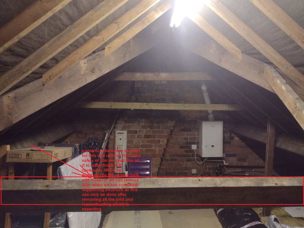 Mubbashshir Posted April 21 Posted April 21 (edited) There is rafter tie joist in the middle of the loft and structural engineer has recommended not to disturb it and build the loft room on other side. As constructing alternative support for this and later removing this Rafter tie Joist safely can be expensive as we have to remove all the roof joists and roof to construct alternative supporting structure. Also for your information there are some joist which are cracking due to age however it is not causing any structural integrity issues as told by the structural engineer and he will be recommeding to contact some timber treatment company which can inspect and provide further feedback. Note: My structural engineer is charted sturctural engineer so he is quite competent however since he owns the company he may not want to design anything which can put this insurance at risk unless, I suggest him or push him. My Questions: 1. Any possible way of building alternative supporting structure in place of Rafter tie joist(without reonsturcting the roof). If you have any idea, I can ask the structural engineer to design in that direction. 2. Can we keep this Rafter tie joist as it is and finish loft coversion. Will it be approved by BC?. It may look odd because to go on other side of the tie joist, we have to bend below it or go over it. However we can remove later when we can construct supporting structure as this may require re-constructing whole roof by removing existing room. Edited April 21 by Mubbashshir