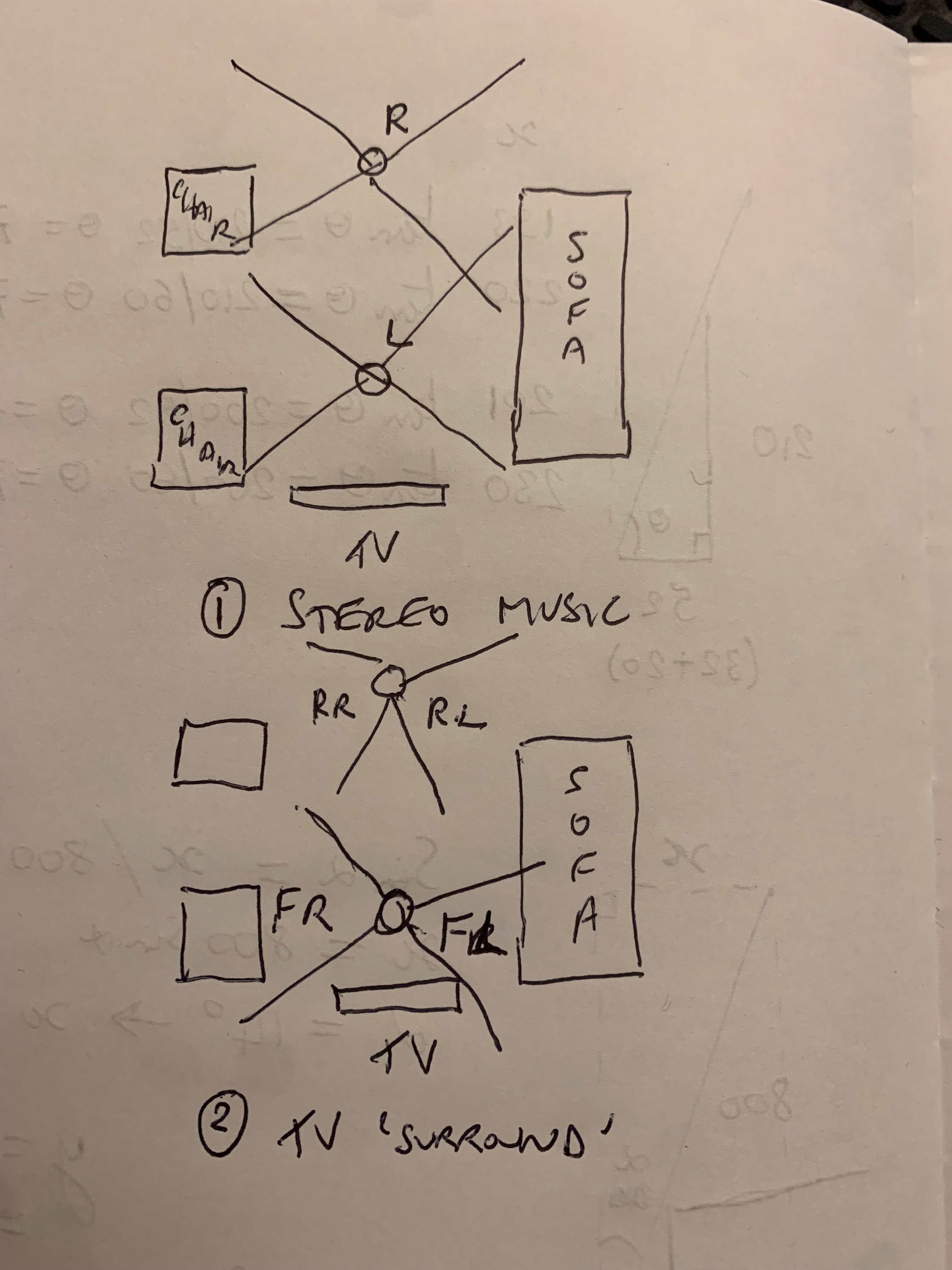 Spinny Posted October 4 Author Posted October 4 Looks like you have the standard layout there pocster, sofa facing TV, two speakers at the front, two speakers at the back/overhead when you want surround sound. However when the sofa is at right angles to the TV (TV will be on an arm) things seem more tricky. Our furniture layout might well end up as the sofa facing out through the bifolds, and then two chairs in front of the bifolds and opposite the sofa. So now if you want to sit on the sofa and listen to some stereo music, you need 2 speakers left and right side somewhere in front of the sofa. But if you were watching TV then the speaker nearest the TV would be the nearest to 'front' and the other speaker the nearest to 'rear' wrt the TV position. In effect you are kind of facing one way to listen to stereo, and a different way to watch TV. See sketches. 1