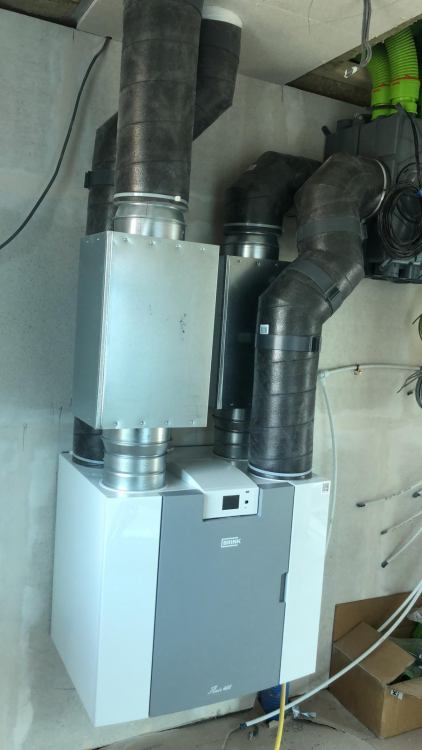 Nickfromwales Posted October 7 Posted October 7 2 hours ago, Nick Laslett said: @S2D2, I bought all my spiral ducting form the Duct Store, like @JohnMo. https://www.ductstore.co.uk/acatalog/Attenuators.html They have attenuators. I used the Lindab Safe Click system, which has rubber gaskets. I bought all these components direct from Lindab. Just find the nearest sales office to you. https://www.lindab.co.uk/Products/ventilation/Sound-attenuation/?sort=popularity&display=16&page=1 They have a huge choice of attenuators. If you want to be confident that you are going to cut most of the MVHR unit sounds before they hit the manifold, you need an attenuator that is 1000mm long. If you look at the spec sheet for the Lindab Attenuator, the difference between 500mm and 1000mm is significant. A semi-flexible radial system will also help mitigate the noise. Also, you don’t want your individual ducts going to a supply outlet being too short. Here is a photo from one of @Nickfromwales installs showing 500mm attenuators, foam insulated ducts and a Ubbink manifold. I added a 3rd attenuator to that job, as the client wanted “graveyard in Gravenhill” levels of shhhhh! at night. Then foam duct defo helps out, but I’m now being ‘directed’ towards spiral galv rigid ducting against my will….. I’ll do one and see if it passes muster, if not I’ll be reverting back to foam.