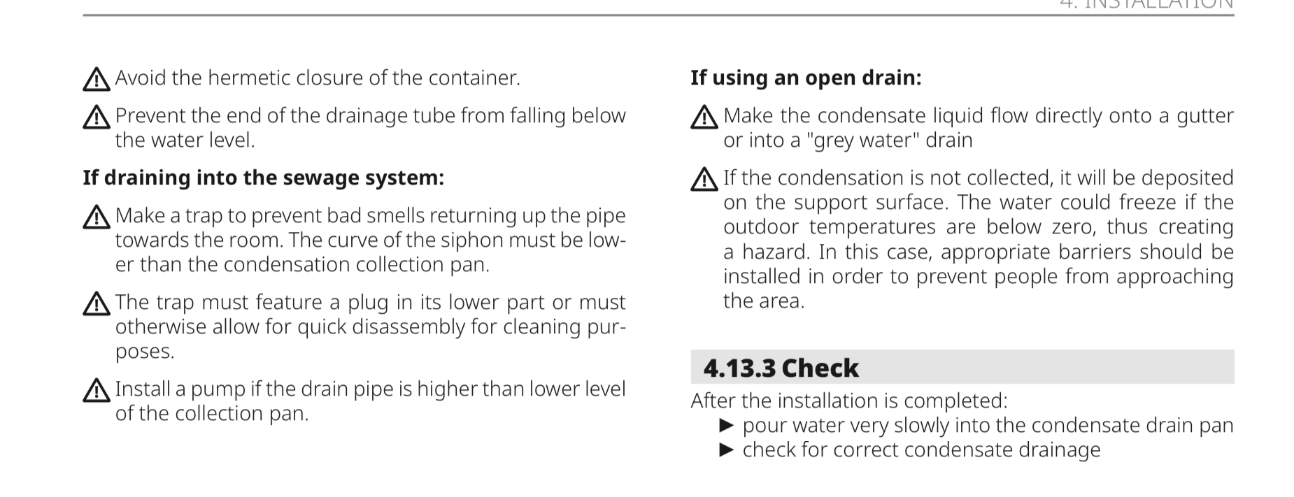 Nick Laslett Posted 23 hours ago Posted 23 hours ago (edited) Here is the page from the installation manual for the floor standing unit. Source: https://shop.dhps.nl/Article/DownloadAsset/Installatiehandleiding Panasonic ventilatorconvectoren P-FAL serie (Engels).pdf?documentId=assets/1043/d4cdab92f98c4a15b453b97b9addb49e Basically you route the condensate pipe to a soil vent stack. Use a waterless waste trap between the condensate pipe and the SVP connection. Like this: https://wavin.com/gb/p/c5d3a02d-0d50-4ebb-a3a7-ff44fe446e57/osma-hepvo-waste-valve-32mm-white The condensate pipe will need an adapter to convert it to 32mm for the waterless waste trap. I did find a smaller 21mm trap here. The condensate pipe diameter is 14mm. https://www.greenmillac.com/Waterless-Trap-3-4-inch In an ideal world you will be able to access the waterless trap, as eventually it will need replacing. Edited 23 hours ago by Nick Laslett