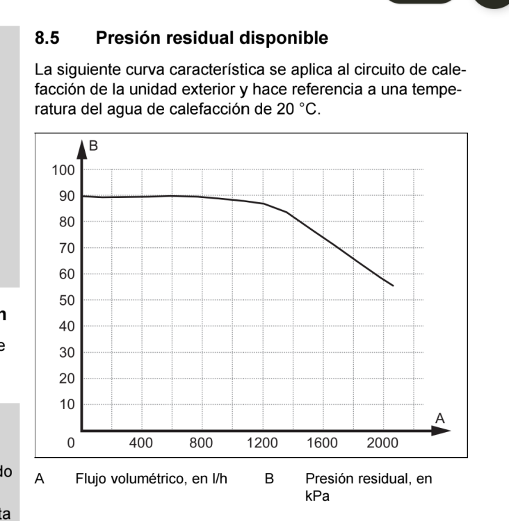jamesdiyer Posted 5 hours ago Author Posted 5 hours ago 6 hours ago, SimC said: Assuming the pump is performing correctly at 100% speed, yes you can use the chart to lookup the reported flow value to determine the pressure generated by the pump. I would have expected the Vaillant technician to have measured the pressure drop of the HP heat exchanger, or at least the residual pressure difference between the flow and return connections to the HP unit with the pump running. The 70 kPa developed by the pump is all lost across the whole circuit including the HP heat exchanger, so if the heat exchanger loss is say 25 kPa then only 45 kPa is available to generate the required flow in your heating pipes and emitter system. The published Vaillant manual should at least provide the expected HP HEX pressure drop at design flow rate, and the residual pump pressure for your system. My work involves interacting with air and water balance specialists usually in commercial buildings who validate by measurement with calibrated instruments that a system is performing as per the design criteria. By just relying on a unit display value, and not by seperate measurement, Vaillant have not proved that their unit including pump is actually performing to specification. Obviously you have also highlighted concerns with sections of the distribution pipework sizing, that should also be resolved to improve the resulting flow rate when heating, but you could be chasing your tail if it turns out there is an issue with the pump not actually generating 70 kPa pressure. Thanks for the explanation. That's interesting. The graph, which I didn't copy well I re attach. It is 'residual.pressure available'. Page 39 here https://www.vaillant.es/product-images/0020326641-03.pdf.pdf Let me have a think about your point, though I think it would be a case of pushing vaillant to confirm that, after having changed piping. I'm just concerned about pushing the installer to change piping, but not for a buffer, and then still not hitting this magic flow rate. And then having the fit a buffer still, or just not fitting a buffer if we hit a flow rate I deem ok.