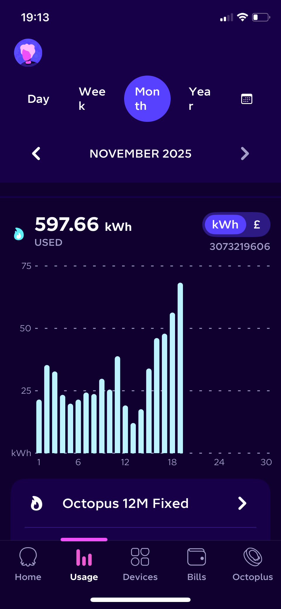 marshian Posted 6 hours ago Posted 6 hours ago 2 hours ago, damspt said: I’ve noticed that it’s been since Monday (17/11) that we have been using a lot of electricity, I’m not sure if it’s a coincidence but our new fridge came on that day ( same as the previous one but had to be changed due to a fault ) HDD data for my house by day Raw Data below - I scaled the total kWh per day by dividing by 6 (so 25% or the other two (HDD and kWh per HDD get lost at the bottom Either way weather gets colder energy usage goes up or house gets colder - choice we have to make in winter (or a choice we don't get to make) Date HDD kWh/HDD kWh Scaled Total kWh 07/11/2025 3.6 4.34 2.60 15.6 08/11/2025 4.6 3.30 2.53 15.2 09/11/2025 6.9 3.77 4.34 26.0 10/11/2025 5.0 4.43 3.69 22.2 11/11/2025 5.3 6.60 5.83 35.0 12/11/2025 2.8 5.21 2.43 14.6 13/11/2025 3.9 2.02 1.31 7.9 14/11/2025 5.8 1.94 1.87 11.2 15/11/2025 6.7 4.33 4.84 29.0 16/11/2025 8.4 4.50 6.30 37.8 17/11/2025 11.4 4.19 7.95 47.7 18/11/2025 13.1 3.99 8.72 52.3 19/11/2025 12.4 5.17 10.68 64.1 20/11/2025 15.2 4.61 11.68 70.1 21/11/2025 14.0 4.94 11.53 69.2