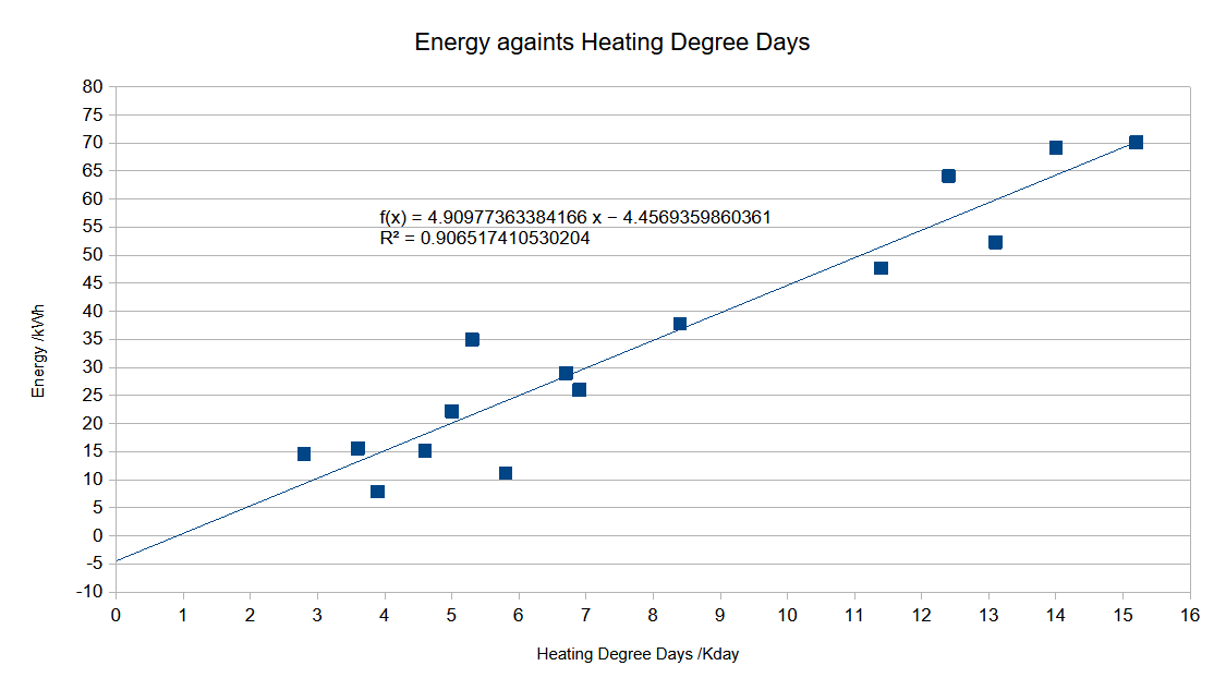 marshian Posted 5 hours ago Posted 5 hours ago 6 minutes ago, SteamyTea said: I re-charted your data in a more suitable way, but as I do not know what HDD base temperature you used, was it 15.5°C as that is the usual UK default, I suspect it is not giving a true picture, as at 1 HDD, your house has no base load. 15.5°C is really a reflection of our shoddy housing stock and crap heating systems. At 3 HDDs, and 3°C is a typical house temperature above OAT when there is no heating on, your daily, non heating, load seems to be about 10 kWh. Adjusting the base HDD temperature, and with a full years (or more is better) worth of data, should show you the DHW usage and any parasitic loads. I have found that HDDs are not very good for homes like mine that have E7 heating as during the shoulder months it is too easy to have an overheated house. I also have a secondary issue in that half the time my house does not draw anything from the grid, this skews the numbers if I try an calculate it at the hourly level to reduce the effects of the overheating issue. Where HDDs work well is in offices that are fully climate controlled i.e. very stable internal temperature. Base is 16.5 (once daily average temp falls below this heating is required - have a few years data that backs it up) Base temp was worked out using on-line regression tool with 2 years of daily heating data (with HW/cooking energy usage removed) it’s an 1980’s build that I’ve tried to bring kicking and screaming into a more insulated state - biggest issue is it’s shape - fundamentally it’s a T shape so a number of rooms have 3 external walls (north facing frontage being the worst areas for heat loss) I was planning on re-running the regression tool after this winter to see if the most recent improvements have made any difference (loft insulation increased to 300 mm from a depth of 75mm to 150 mm)