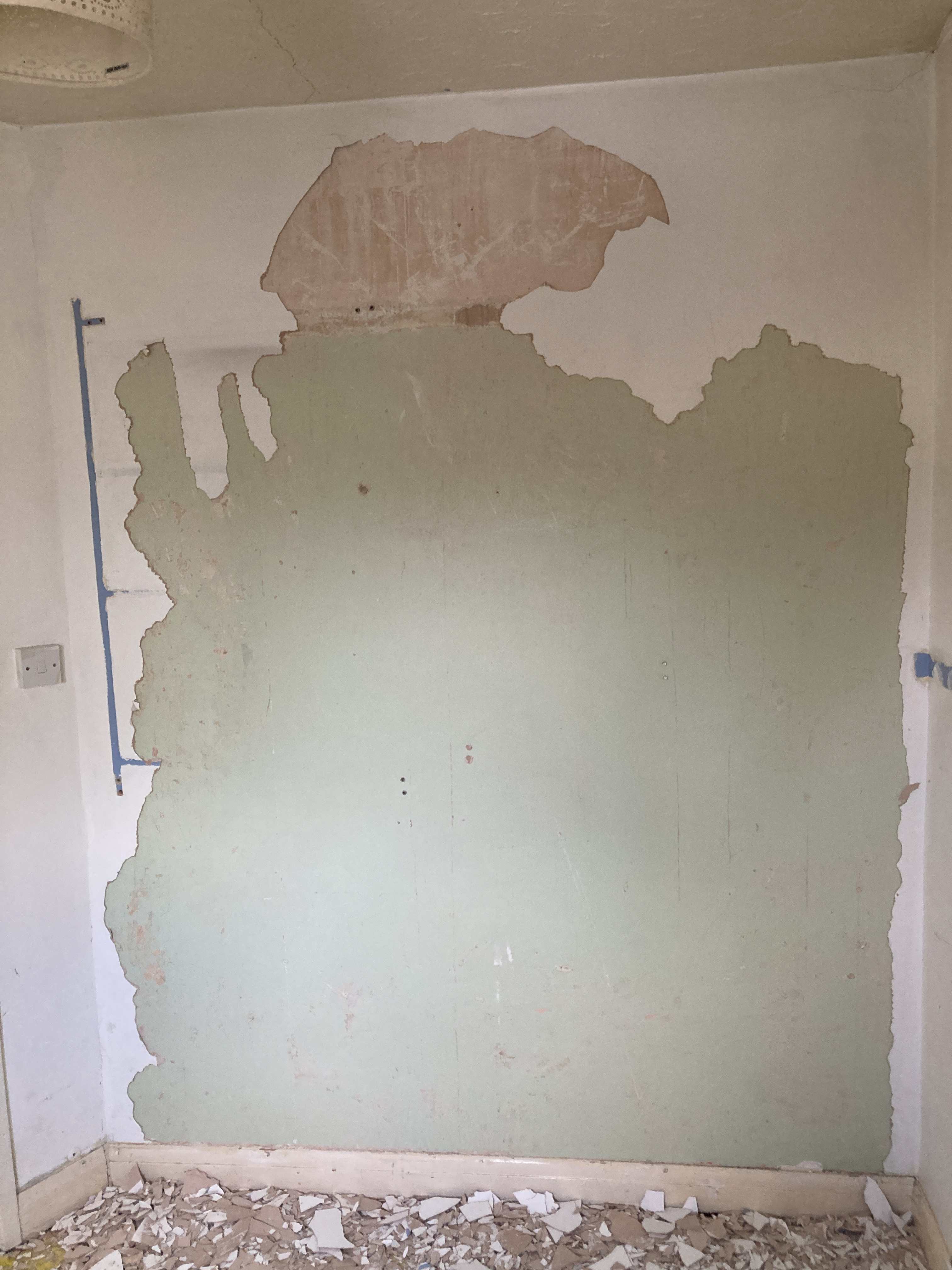 jfb Posted 11 hours ago Posted 11 hours ago I need to plaster a wall where the most recent skim wasn’t well bonded. I've scraped all the skim off the wall now and wondering best way to re plaster it. The green section you can see in the picture is old wallpaper - very thin and well bonded to the wall (no flaking/weak spots) and would be very tricky to get off. two questions. 1. do we think it should be ok to apply a couple coats 1/3 pva/water and then skim over? Or would I be better off using some blue grit? 2. In taking off the failed skim I have made a couple of small patches that have gone back to the blocks and need filling - what would be the best option for filling them to allow skimming after no more than 24 hours (don’t particularly want to buy a whole bag of bonding for such a small amount)