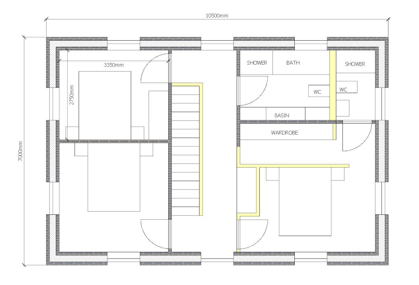 Oz07 Posted 19 hours ago Author Posted 19 hours ago 17 minutes ago, Iceverge said: A shrunken version of when we built. I really really hammered costs as it was our 3rd set of planning and I was trying to save money. 400mm cavity wall for good U values at minimum cost. Some plans have walls 200mm wide total which might bite you when you come to a detailed design. Similarly some of the stairs would be very steep. I would allow a run to rise ratio of at least 10:7. With a 185 rise you'd need a 265 run. and if you have 2650 ceilings you'd need nearly 4m of stairs run. Ours is 191/250 rise to run and it's too steep. I can't make peace with stairs that aren't straight as they waste so much spaces floors. The plumbing is concentrated in one corner. All the waste pipes can run through the stud between the utility and the downstairs WC. The upstairs blockwork matches downstairs. Good for costs and noise. The whole thing can be built with standards timber joists even with MVHR. Just drop the ceiling in the utility for services. A utility cloaks off the front door gets use all the time and a "walk through" design is far far better than one with corners as they always get blocked with crap. Sensible window spans mean you can use all off the shelf concrete lintels. £1000 would do the house. Every bedroom has cross ventilation and windows on two aspects which make them feel bigger than they are although this may not be possible in your situation. With a bit of DIY I would think you'd get the above built for £250k. This could suit us the more I look at it. I think we'd have some better sizes than on that plan because we would be at 7.25 x 10.25 internally after plastering. 11x8m overall externally. Allowing for 375mm finished wall thickness.