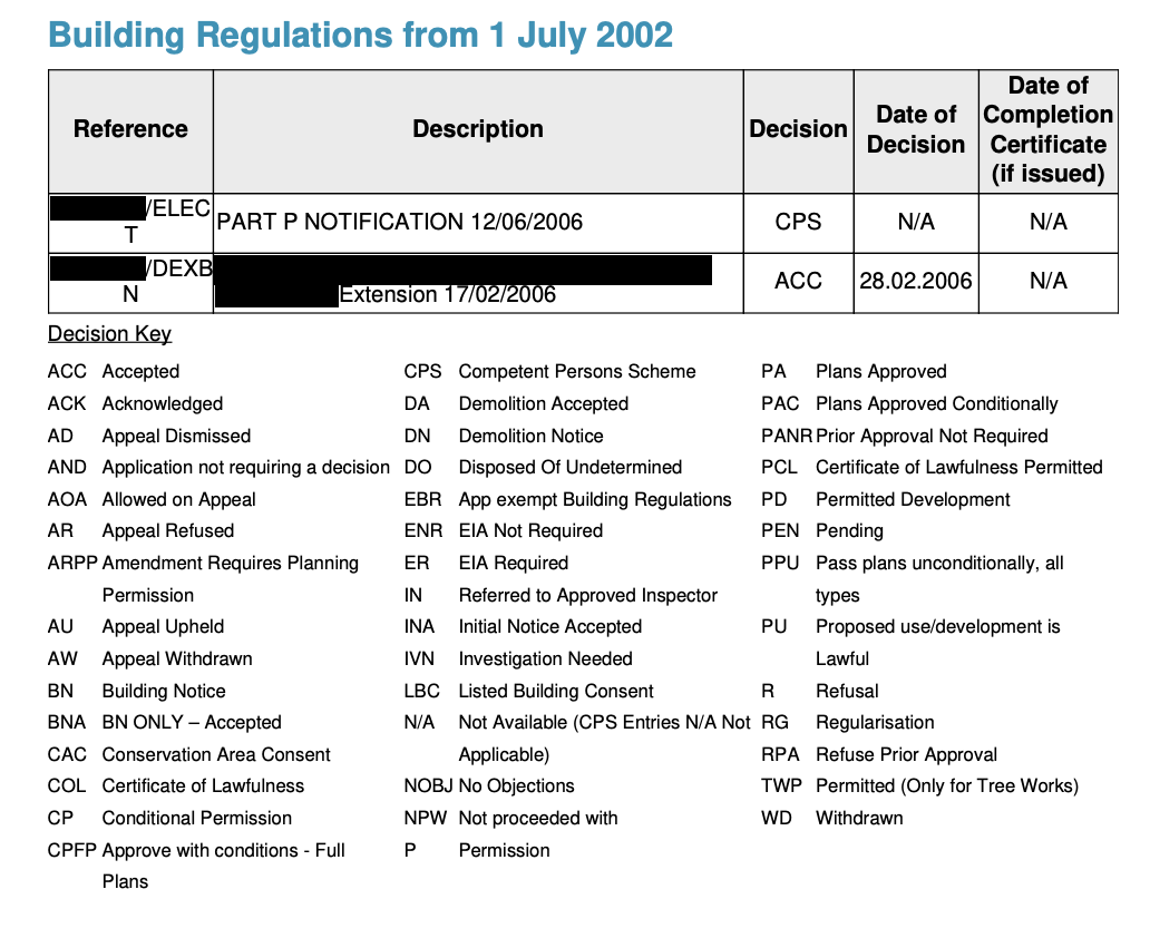 WhiskyInTheJar Posted 9 hours ago Posted 9 hours ago Hi, I'm in the process of purchasing a property and the below has come up on the searches. It relates to an adjoining garage which was converted into an extension of the living room. Our conveyancer says that this is proof that building regs were signed off. However, since the person who carried out the work had only owned the property since 25 January 2006, I think the 17/02/2006 date reflects when notice was given of works to be carried out, 28/02/2006 reflects when the notification was accepted, and I suspect that 12/06/2006 represents the electrician signing off their own work under CPS, presumably nearer the end of the conversion project. I'd really appreciate the thoughts of anyone with a bit more experience and understanding in this area. Thanks in advance!
