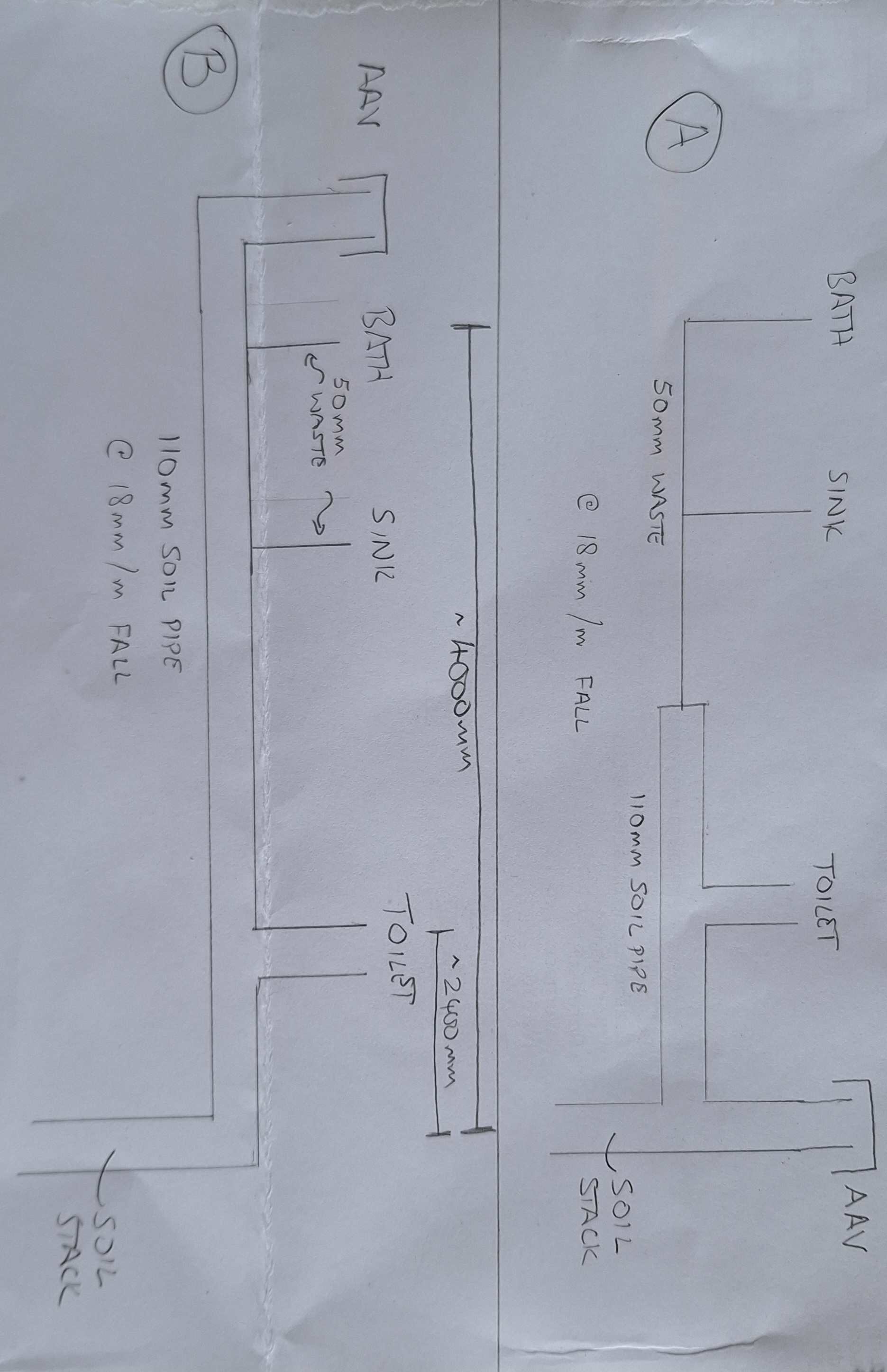 Nickfromwales Posted 6 hours ago Posted 6 hours ago 1 hour ago, Dunc said: To be clear @Nickfromwales whichever scenario is used, the soil stack and AAV (and everything else in the drawings) are indoors on the first floor - the soil stack does not penetrate the ceiling or wall here it just drops to below the slab and exits there. Hence the requirement for the AAV inside to let air in. Gas venting is outside. Access not a problem as this is all in a service coomb behind a false wall. Does this change your view of Option A? Ah, sorry, read it as if the riser was outside. A is fine, and if you run the bath waste in 50mm and branch off in 40mm for the basin (reducing to 32mm at the trap) then you want even need an AAV at the bath; as per @Russell griffiths comment, if there’s room to fit an upstand and regular AAV behind the bath panel then it’s cheap insurance. 1